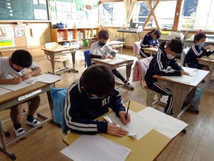 2年 書き初め練習 公開日 2022/12/19 更新日 2022/12/19 各学年から 12月19日(月)、2年生の書き初め練習の様子です。お手本を見ながら、とても丁寧に書いています。自分の字とお手本の字を見比べながら、どこが違うのかを真剣に考えている姿が印象的でした。自分で直したいところを見つけることができると、どんどん上手になります。 2年