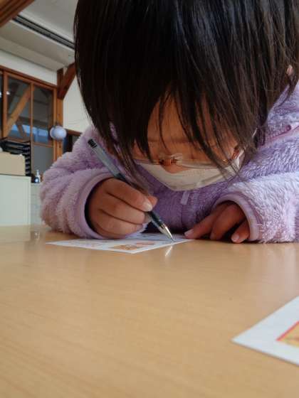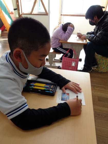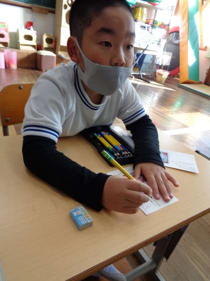 12月19日(月)、善意文庫のお礼に出す葉書をかんばって書いている8組さんです。お手本を見て書いたり、まず下書きを書いてなぞったりして、小さな字もしっかりと書きあげていました。