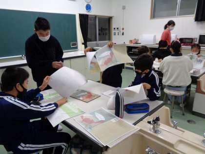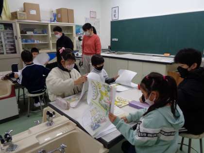 12月22日(木)、朝の活動で地区ごとに集まり、朗読訪問の分担を確認しました。自分が話すところに色を付けていきます。