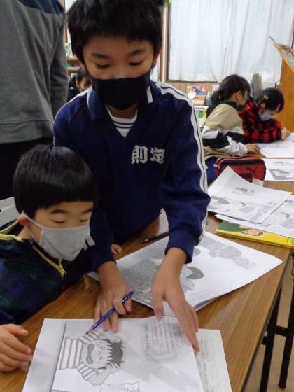 自分が話すところを一生懸命探します。低学年には、高学年が見ながら、教えていきます。