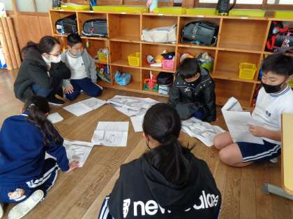 高学年が低学年にどこを読むか、どんな風に読むかを教えてあげながら、練習を進めていきます。