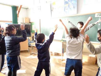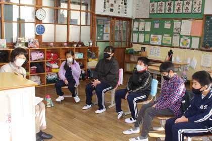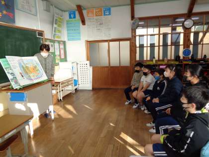 一生懸命、本を見つめる子どもたち。大型絵本を使った読み聞かせでは、途中で一緒に「イカダンス」を踊っていました。