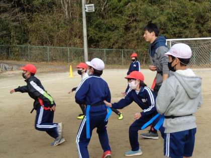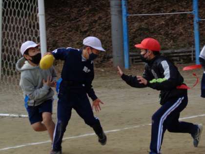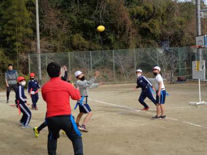 2月6日(月)の元気っこクラブは、タグラグビーです。ラグビーボールのキャッチには苦戦しながらも、果敢に攻めていきます。