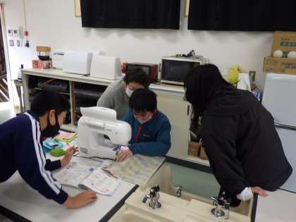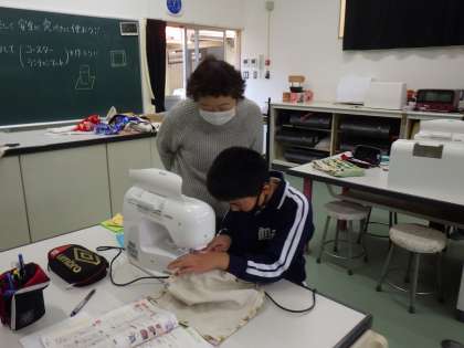 2月8日(水)、地域ボランティアの澤田さんに来ていただき、ミシンの使い方を教えていただきました。丁寧に見ていただき、全員作品が完成しました。