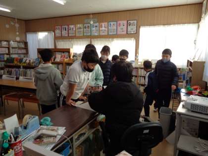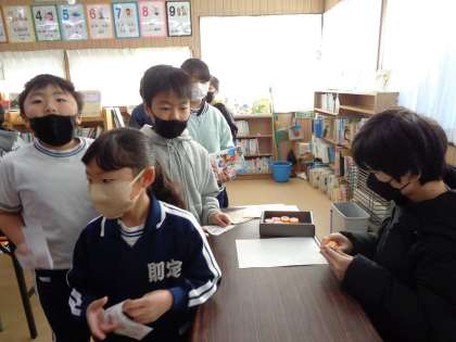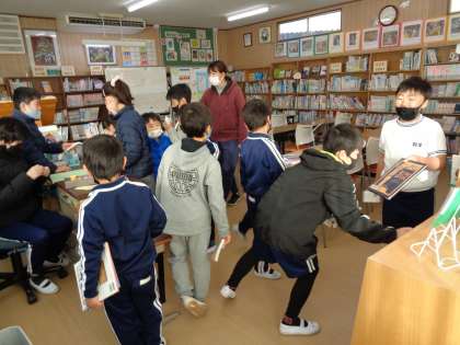 2月9日(木)、「本LOVE読書祭り」の4日目朝の図書館です。今日は、朝のクイズの発表が少し遅かったので、答えようとする子たちが列になって待っていました。