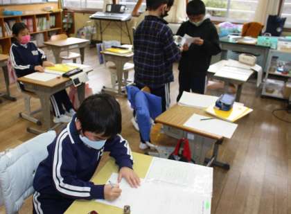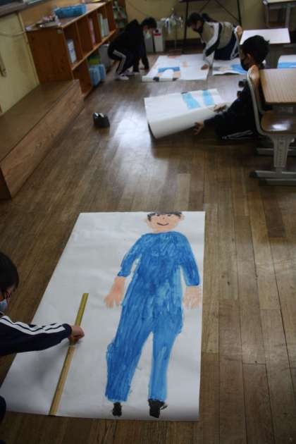2月13日(月)、生まれた時のお話を家で聞いてきて、文章にまとめていたのは2年生です。小さい頃の写真をお互いに見せて、「かわいい」と言い合っていました。今の自分の隣に、生まれた時の自分の大きさを比べて描きます。どれくらい大きくなったか、すぐわかりますね。