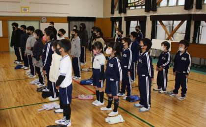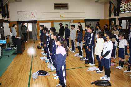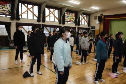 2月13日(月)、全校朝会の後で、卒業式の歌の練習をしました。初めて、全員が声を合わせました。
