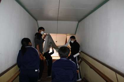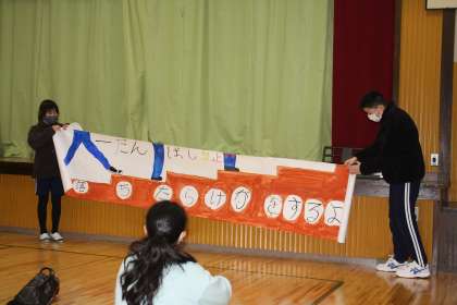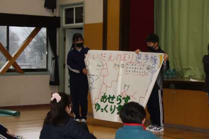 2月13日(月)の委員会の時間の様子です。大きなポスターをどこに貼るかを検討中。みんなが見えるように、考えていました。
