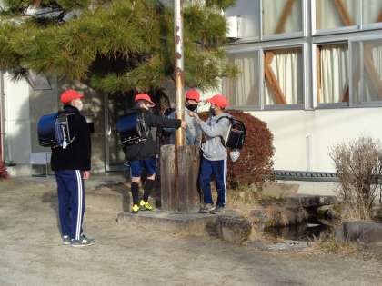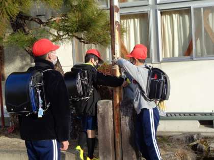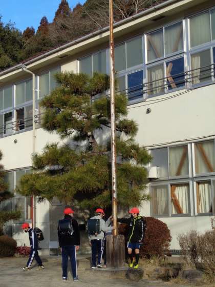 2月15日(水)、国旗上げ修行が続く人たち。掲揚塔の周りをぐるんぐるんまわって、上手に縛っていきます。見守るのは6年生です。