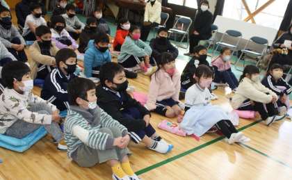 最後は、紙芝居です。「サメにのまれたゲンナさん」。サメに飲み込まれてしまった医者のゲンナさんがどうなるか、息をのんで聞きました。