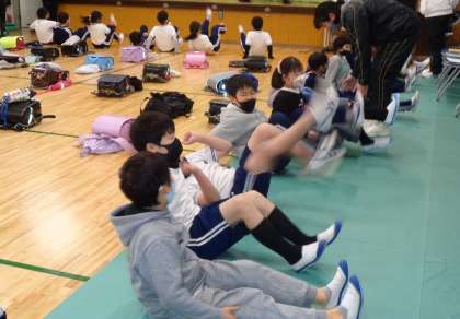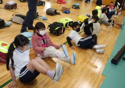 怪しい人はだれかのクイズをしたり、則定学区の東大島グランドの写真から、どんな場所に気を付けたらいいかを考えたり、実際に「助けて」の声を出したり、捕まった時の逃げ方を全員でやってみたりしました。また、ランドセルについて防犯ブザーを一斉に鳴らして、ちゃんと鳴るかも確かめました。