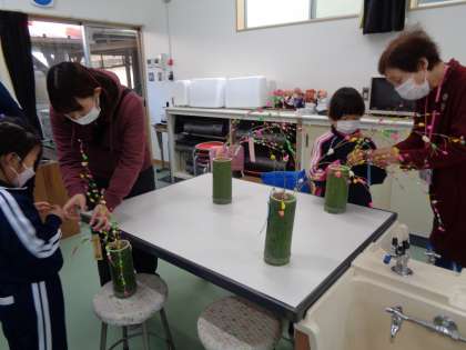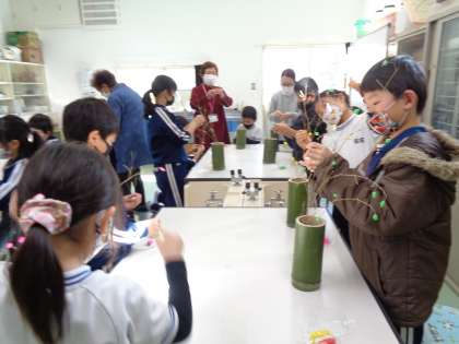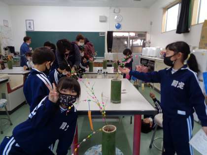 1・2年 もちばなづくり 公開日 2023/02/17 更新日 2023/02/17 各学年から 2月17日(金)、足助観光協会にご協力いただき、1・2年生がもち花づくりを行いました。「食べたいな」と言いながら、レンジで温めた、色とりどりのもちを竹にくっつけていきます。とても素敵なもち花が完成しました。 教室に戻るときには、「明かりをつけましょ〜」と歌う声が聞こえてきました。風は少し冷たいですが、どんどん春が近づいています。 1年 2年