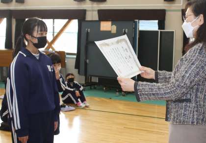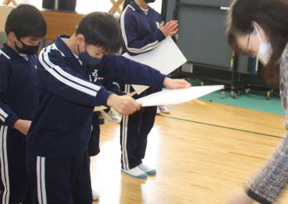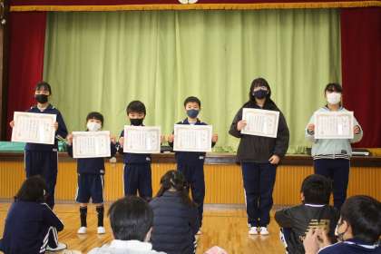 2月20日(月)の全校朝会で、書き初め大会の特選、秀逸作品の表彰伝達を行いました。入賞者のみなさん、おめでとうございます。書き初め作品は、約1か月の間、教室前廊下に掲示しました。また、来年も頑張りましょう。