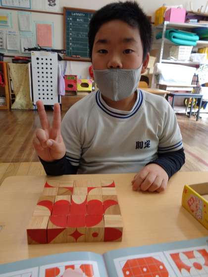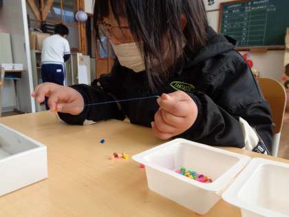 2月22日(木)の8組さんです。難しいパズルを完成させてピースです。最後の1個がなかなか見つからなくて、一つずつひっくり返して探しました。ビーズ通しも真剣です。小さいビーズもしっかり持って10個通すことができました。