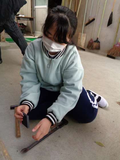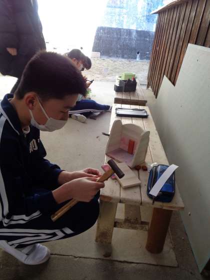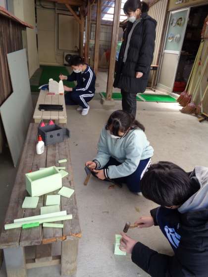 6年生が板を切り、色を塗っていた図工の作品の完成形がついに見えてきました。2月22日(木)は、釘を使って組み立てていきます。自分の思う形がもうすぐ完成しそうです。
