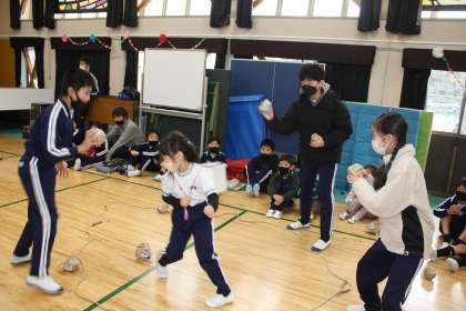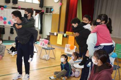 続いて、1年生も6年生との対決です。6年生のおかげでスーパー1年生になったので、その強さを見せようと頑張りました。最初は、逃げるかごに玉を入れるゲーム。たくさん玉を入れたら勝ちです。これは、6年生が上手に投げる玉をかわして、勝ちました。続いては、1年生をおんぶした6年生と二人ペアの1年生とのリレー対決です。1年生を軽々とおんぶしてくれた6年生ですが、1年生の足も速く、1年生が勝利しました。