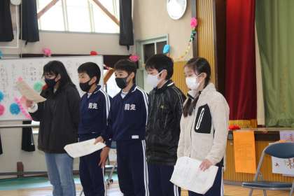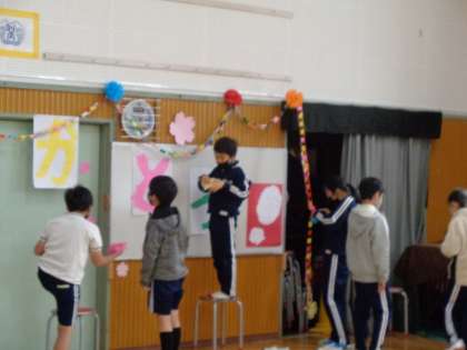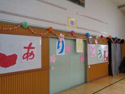 6年生が退場した後、5年生が協力してくれた1〜4年生に感謝の気持ちを伝えました。会場の後ろに飾られた「ありがとう」は、8組さんが一つ一つ画用紙をちぎって貼り絵したものです。4年生も、5年生と一緒に会場を片付けました。