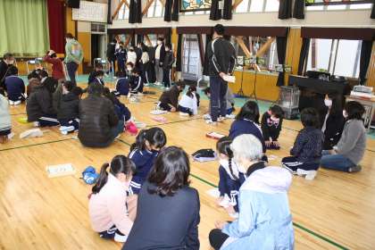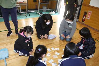 はじめは、感謝の思いを伝える手作りの感謝会かるたをグループで行いました。地域の方にしていただいたことを題材にして、B班の子どもたちが言葉と絵を考えて作りました。どのグループも和気あいあいとかるたで楽しみました。