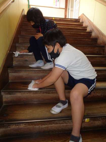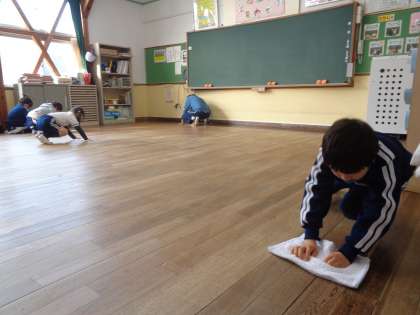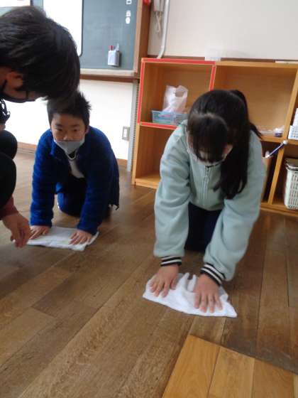 3月10日(金)の朝は、からぶきからスタートです。手に手に雑巾を持って、ごしごし磨き上げます。