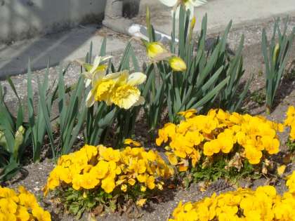 11月に植えたハンジ—は、最近の暖かさもあってか、とてもきれいに咲いています。卒業式の日は、会場を華やかに飾ってくれるはずです。水仙も咲き始めました。