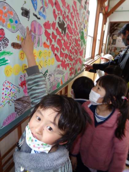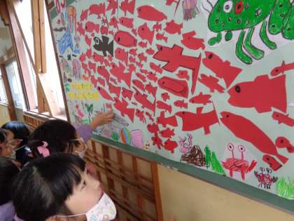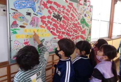 1年 卒業のお祝い 掲示 公開日 2023/03/13 更新日 2023/03/13 各学年から 1年生の教室前に、卒業を祝う素敵な掲示が貼られました。「このクラゲは私がかいたよ」「この魚は僕がかいた」と教えてくれる子どもたち。国語で学習したスイミーのように「力を合わせてがんばってください」のメッセージが添えられています。 1年