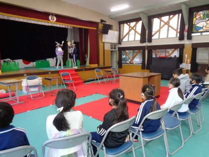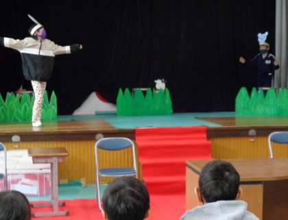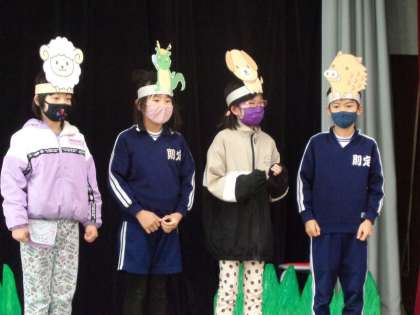 3月14日(火)、3年生が1、2年生を招待して、英語劇を見せました。かくれんぼで、草むらに隠れている動物を「something ○○」と言いながら、見つけていく劇です。すべて英語で堂々と演じていました。