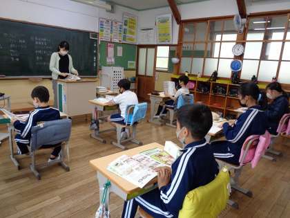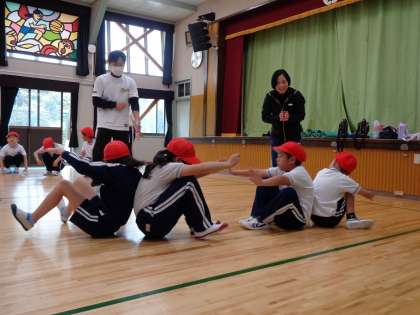 3・4年生は、体育で体ほぐしの運動に取り組んでいました。二人一組になって、背中を合わせた状態で一緒に立つことに挑戦しました。これがなかなか難しく、悪戦苦闘しているペアもありました。