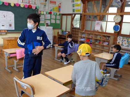 4月ということで、1年生の教室では6年生が寄り添って朝の支度をしています。
