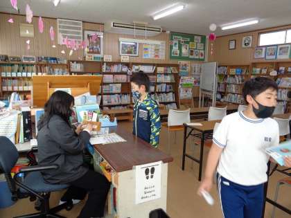 図書室では、委員会の仕事に初めて取り組む3年生の傍らに6年生がいました。