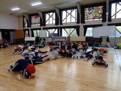 保護者の皆様には学級懇談会にご参加いただいている間、子どもたちは集会室に集まってレクリエーションを楽しみました。
