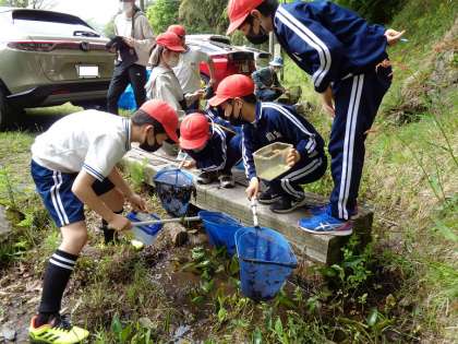 豊田市ラムサール条約活動センター長の猪俣さんを講師に迎え、学校周辺の春の生き物について観察しました。