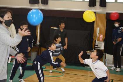 上級生に拍手で迎えられた1年生は、ちょっぴり緊張気味でしたが、5・6年生の趣向をこらしたゲームを進めるうちに、にこにこ笑顔になりました。