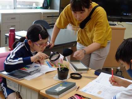 ツルレイシの茎や葉の様子を、虫めがねでじっくり見たり、手で触ったりして、五感を使って観察していました。