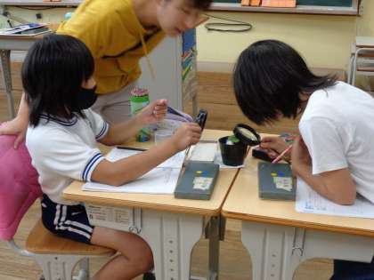 虫めがねの使い方を学んだあと、ツルレイシの観察をしていました。