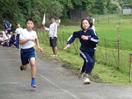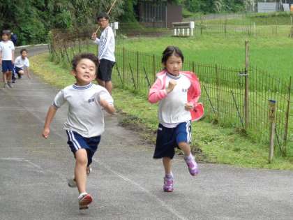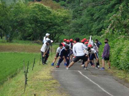 運動場では、直線で50メートルを走れるだけの長さがとれず、学校近くの農道が特設会場です。