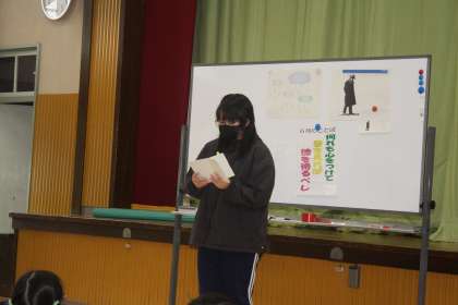 朝の集会で、ライブラリー委員長から読書まつりの説明がありました。