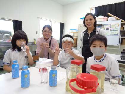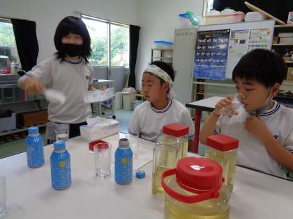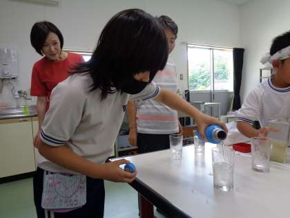 7・8組の子どもたちに呼ばれて家庭科室に行ってみると、黄金色のシロップが待っていました。