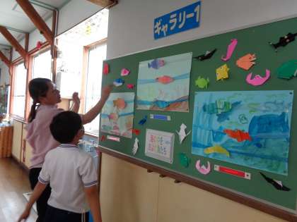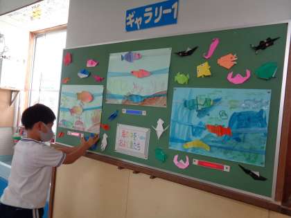 図工の授業で制作した絵や折り紙の作品を飾り、掲示板の前を通ると、海の中にいるようです。