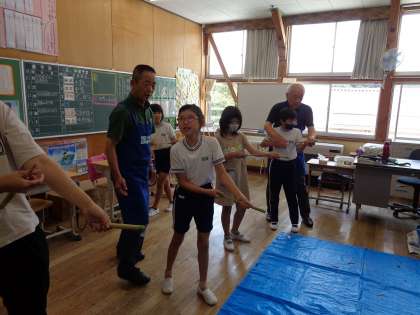 はじめのうちは、思うようにとばなかった子どもたちでしたが、玉の詰め方や棒の押し方のコツをつかみ、最後は、的をめがけて勢いよく玉をとばすことができるようになりました。