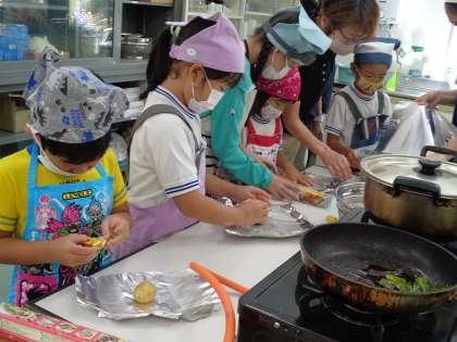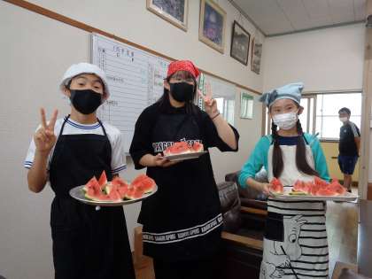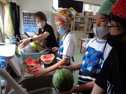 1・6年生 収穫祭 公開日 2023/07/19 更新日 2023/07/19 各学年から 畑で育ててきたジャガイモやピーマン、スイカなどを使って、収穫祭を開きました。 水やりも支柱たても、6年生が1年生をリードして世話をしてきました。 今日の収穫祭も6年生が中心となって調理をし、1年生も嬉しそうでした。 スイカは6年生が切って、全校のみんなにもお裾分けをしてくれました。 とても甘くておいしかったです。 1年生、6年生の皆さん、ごちそうさまでした。