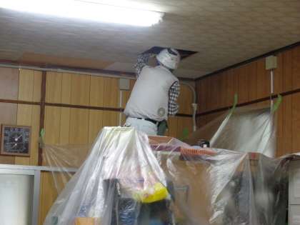 天井に穴を開けるので、ビニルシートで周囲を覆い、けっこうなドリルの音が響いています。