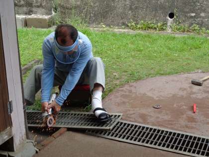 夏休みの学校5 公開日 2023/08/25 更新日 2023/08/25 校長室から 職員昇降口から運動場に向かう渡りの一部分が、木の板が腐り危険な状態でした。 校内整備員さんが、夏休み期間を活用して、腐っていた木材を取り除き、頑丈なコンクリート製のものに造りかえてくださいました。 今日は、側溝のフタがぐらつかないよう微調整をしてくださいました。 子どもたちがこの上を通ったときに、けがをしないよう細心の注意をはらって作ってくださっています。 ありがとうございます。