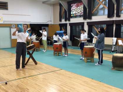 文化クラブは、太鼓の先生をお招きして、和太鼓の練習。