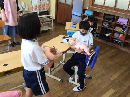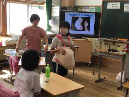 4年生 保健「育ちゆく体とわたし」 公開日 2023/09/25 更新日 2023/09/25 各学年から 思春期におこる体つきの変化について学んでいます。 今日はその発展として、赤ちゃんの誕生について子ども家庭課の職員さんをお招きして、妊婦体験や新生児人形の抱っこ体験をしました。 赤ちゃんの重さに驚き、妊婦さんの大変さにも気づいたようです。 これから心も体も大きくなる4年生。 命の重みをしっかり受け止めて、健やかに育ってほしいです。