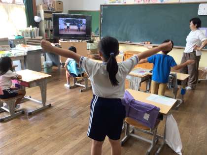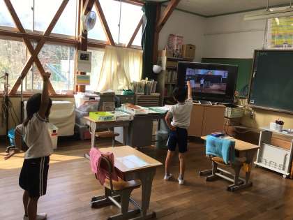 赤白それぞれの高学年の見本動画を見ながら、必死に真似る1年生。
