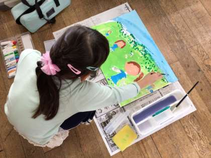夏休みの思い出の絵を仕上げていました。