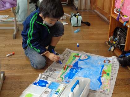 絵の具で色を付けていくと、絵の中の動物たちがさらに生き生きと動き出すような気がします。