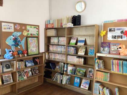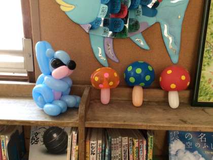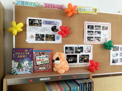 2階廊下の突き当たり、図書館分館の飾りがリニューアルしました。
