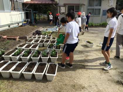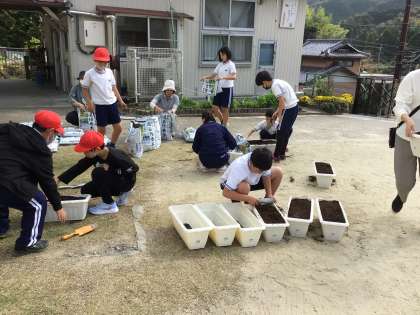 今日は、5年生と7・8組の子どもたちが、全校児童分のプランターに土を入れました。