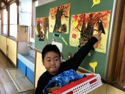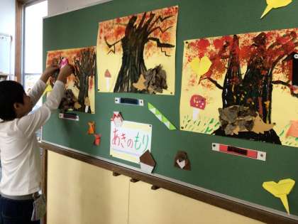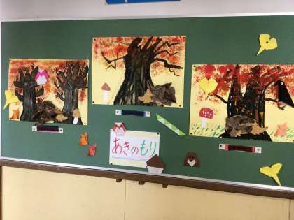 先日の研究授業で取り組んでいた「秋の森」が完成し、掲示板に貼っていました。